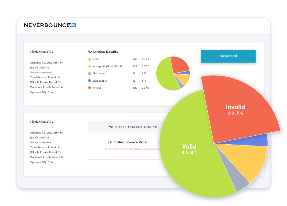 This means that it will tell you if the email is likely to bounce, or if you actually have the right email. While you test email addresses, you can also use the free list analysis tool as a bounce checker. Try out our free email verifier to check if your email is valid! The free list analysis is available in the neverbounce user dashboard. Test your email for free, and find out if it is valid or invalid.